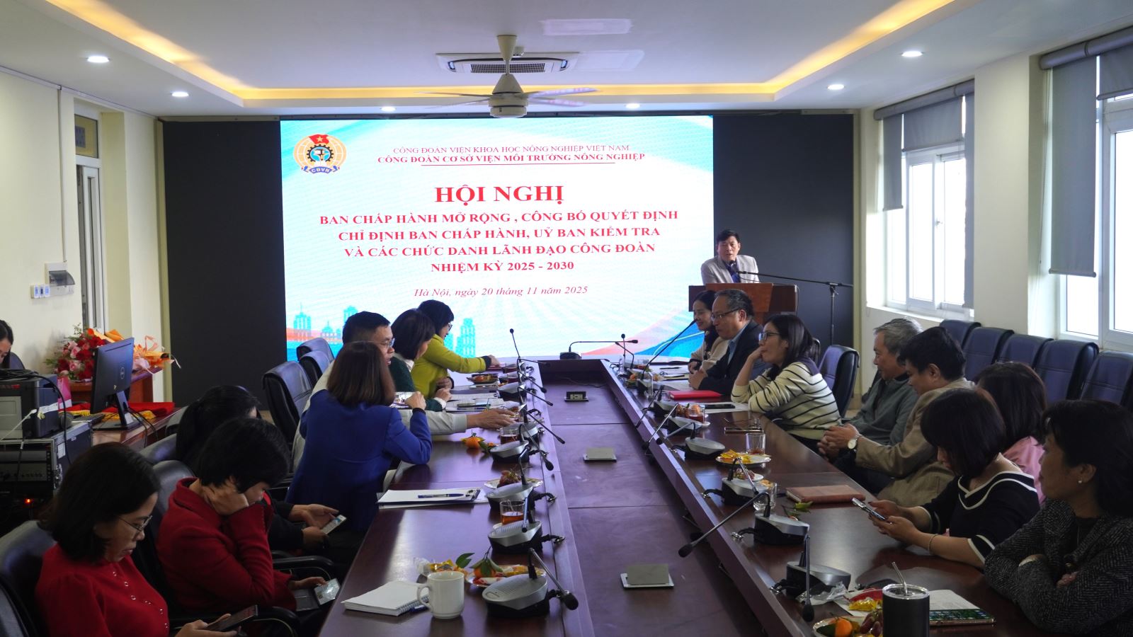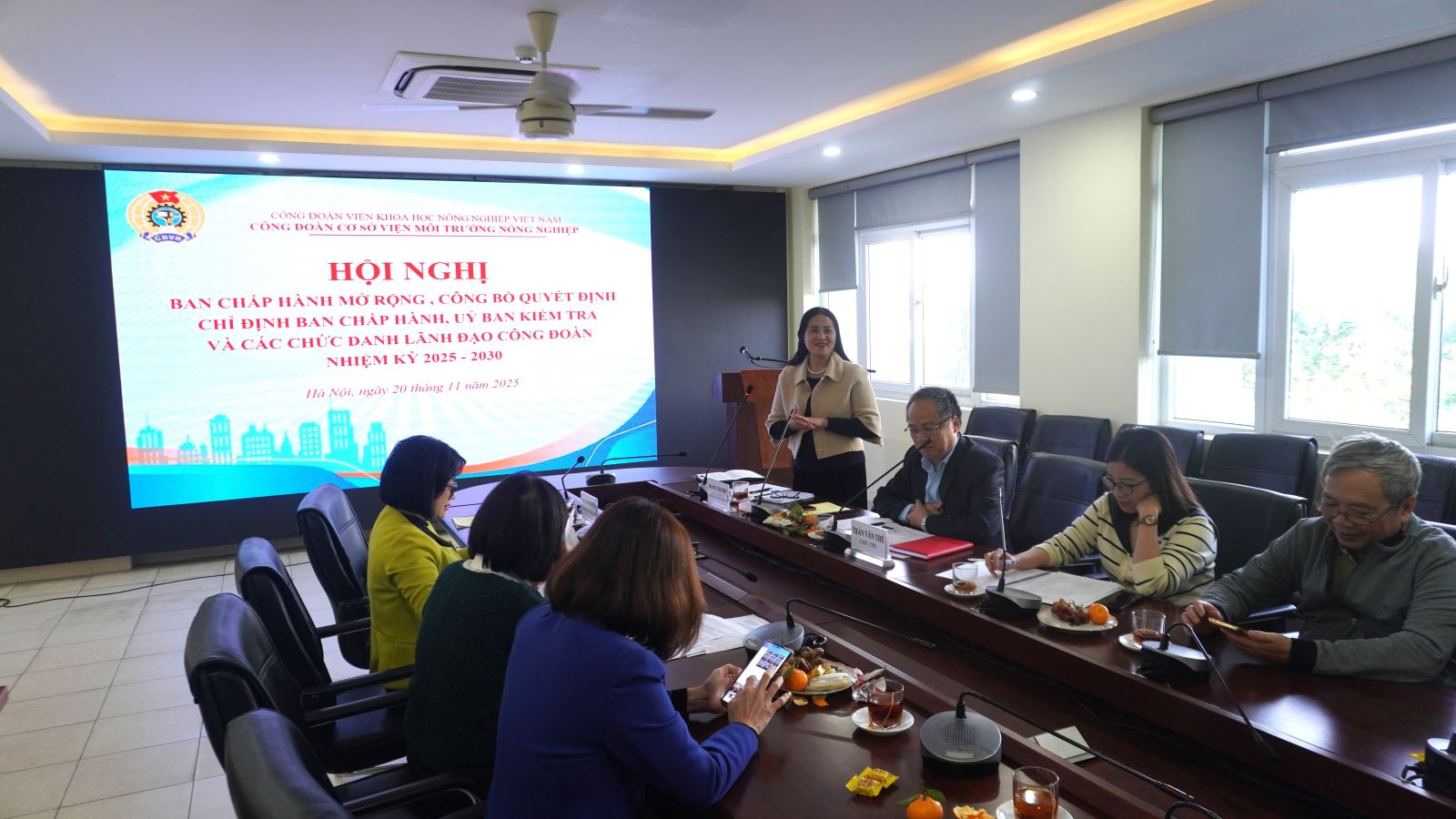 Ngày 20/11/2025, tại trụ sở chính Viện Môi trường Nông nghiệp, Hội nghị Ban chấp hành mở rộng, công bố quyết định chỉ định BCH, UBKT, các chức danh lãnh đạo CĐCS Viện Môi trường Nông nghiệp lần thứ V, nhiệm kỳ 2025 – 2030 đã diễn ra trong không khí trạng trọng, hướng tới Đại hội Công đoàn Viện Khoa học Nông nghiệp Việt Nam lần thứ V, Nhiệm kỳ 2025-2030. Hội nghị vinh dự đón tiếp đồng chí Hoàng Thị Hiền, Ủy viên Ban Thường vụ Công đoàn Nông nghiệp và Môi trường, Đảng ủy viên, Chủ tịch Công đoàn Viện Khoa học Nông nghiệp Việt Nam; đồng chí Mai Văn Trịnh, Bí thư Đảng ủy, Viện trưởng Viện Môi trường Nông nghiệp; các đồng chí đại diện Lãnh đạo các đơn vị trực thuộc Viện, Bí thư Đoàn TNCS HCM, cùng các đồng chí trong Ban chấp hành CĐCS Viện, các đồng chí Tổ trưởng và Tổ phó các tổ Công đoàn trực thuộc.